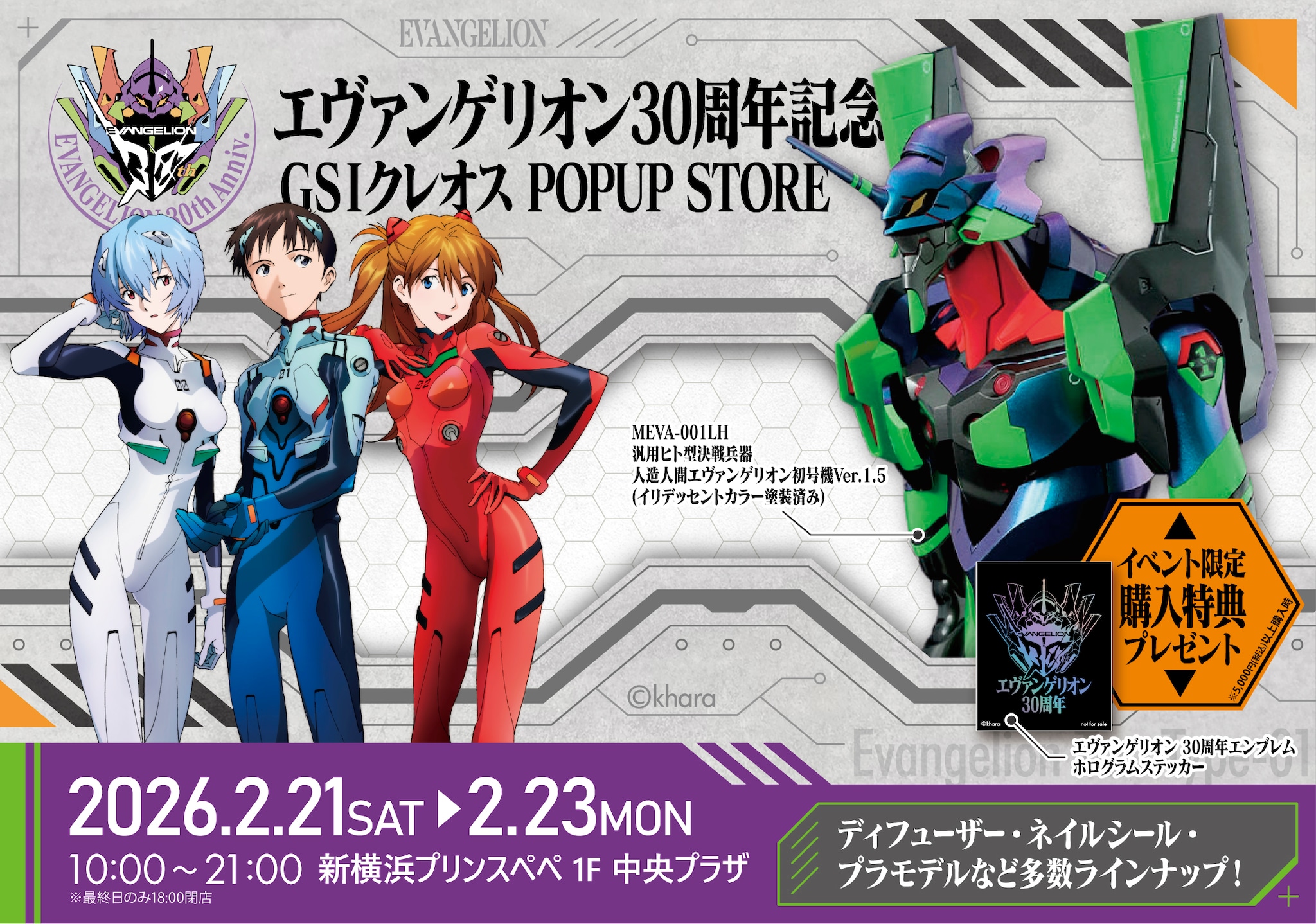 新横浜プリンスぺペ 1F 中央プラザにて、2026年2月21日(土)〜2月23日(祝・月)の3日間、『エヴァンゲリオン30周年記念GSIクレオスPOPUP』を開催いたします。